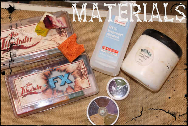 A continuación, montar sus productos. Juro por el ilustrador piel alcohol activado paletas (tengo luz Fleshtone y FX), crema colores por empresas tales como Ben Nye y Kryolan también funcionan bien y son mucho más fáciles en la cartera. Pedir una "rueda de contusión" por todos los colores que usted necesita en un práctico compacto! Además, es necesaria una gran variedad de esponjas: esponjas naranja y negro esponjas son los mejores, pero en un sujetador puede utilizar una esponja de cocina o incluso una esponja de maquillaje blanco texturizar a ti mismo. Yo siempre texturizar superficies mis esponjas atacándolos con las puntas de algunas tijeras puntiagudas afiladas o arrancarlas pequeños pedacitos con mis uñas. Usted también necesitará un polvo translúcido. Mi favorita es RCMA sin Color polvo pero polvo suelto translúcido o pura carne tonos funcionará.