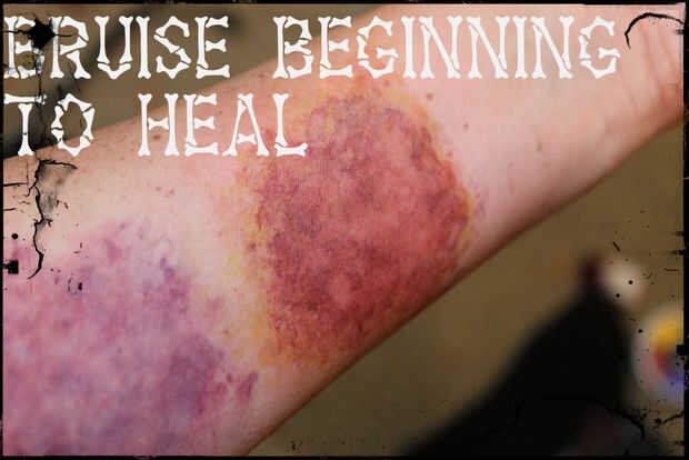 Se trata de un hematoma que apenas está comenzando a sanar. Comenzó con un lavado de amarillo en toda la zona con mi esponja texturizado, luego agrega unas rayas de un color verde amarillento. De eso punteada algunos tonos profundo rojo, púrpuras, azul y marrón rojizo y en polvo.
