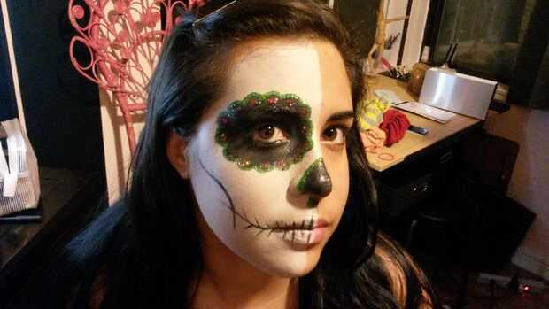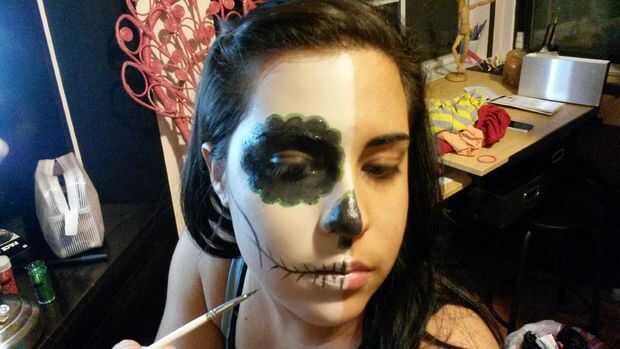 -Tome el pincel que se utilizó para detallar la nariz y la "flor de ojos" verde y usarlo para recoger el brillo y colocarlo a lo largo de la línea verde. Ambas líneas verdes se deben ahora cubiertos de glitter verde.