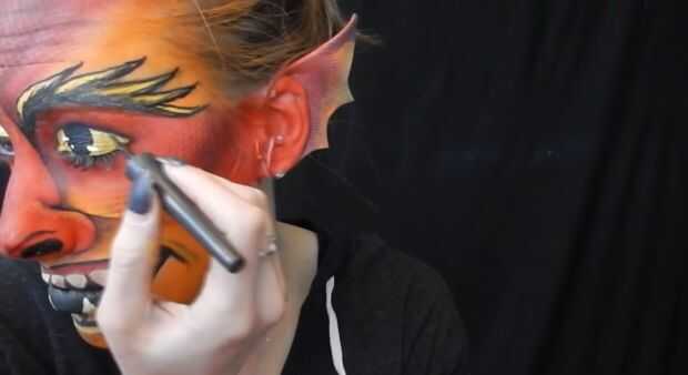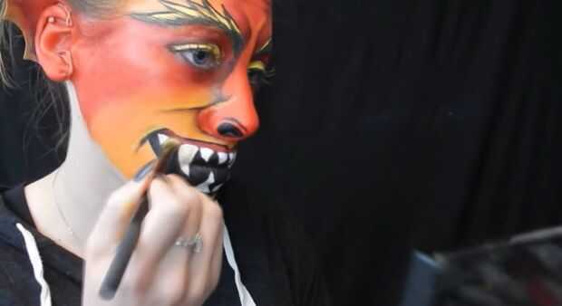 utilicé naranja para resaltar puntos en mi nariz, luego usé delineador blanco para brillo en los ojos, luego con sombra de ojos mate amarillo y marrón en los dientes y forro negro en los ojos para hacer un ojo de gato ala.