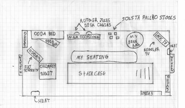 Desafíos; 1) este espacio es básicamente un ático y el techo pistas no un gran problema pero me deja con pocos arreglos de muebles.