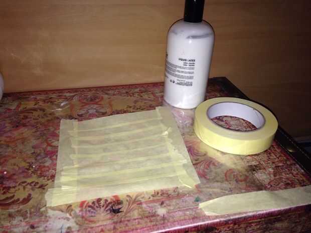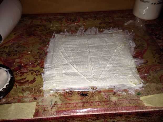 Hacer un cuadrado con la cinta de papel y coloque una capa de látex sobre el mismo. Cubrir con papel higiénico y deje que se seque. Asegúrese de que utiliza sólo una capa de papel, así que dividir su papel en capas delgadas. Cuando esté seco, poner otra capa de látex y papel higiénico y dejar que este seco así. Puede utilizar un secador para acelerar el proceso.