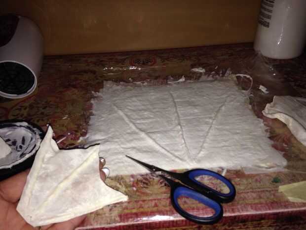 Continuación a enrollar 3 pedazos de papel higiénico y añadir otra capa de látex y poner éstos en la forma de un triángulo. Cubrir otra vez con el látex y poner otra capa de papel higiénico. Repetir este proceso para otro 2/3 capas. Sello de con una capa de látex y deje que se seque correctamente.