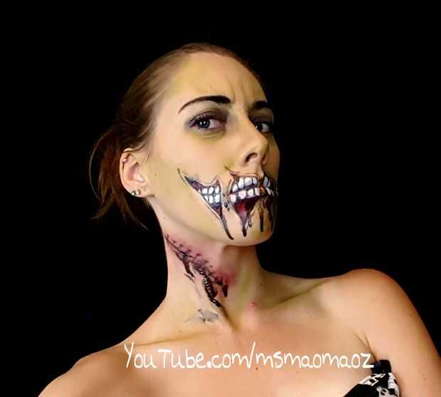 Tutorial de maquillaje de HalloweenPaso 1: cara.1. aplicar una base y 2. polvo3. y 4. Sombras, usar sombra de ojos marrón med, hacer sombras a tus mejillas y narizPaso 2: ojos.5. 6. y 7. Utilizar lápiz de ojos negro y hacer líneas a tus ojosPaso 3: "