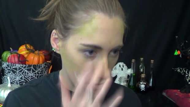 Tutorial de maquillaje de bruja HalloweenPaso 1: la piel. 1. Utilice la pintura de cara verde y aplicarlo a mi cara y el cuello.2. usar pintura negra y hago sombras a mi nariz y mejillas.Paso 2: las arrugas.Usted debe ver el video que usted puede rea