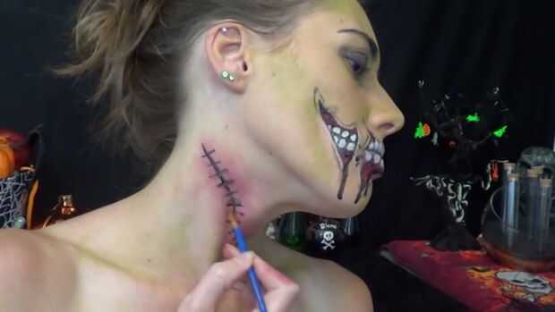 Tutorial de maquillaje de bruja HalloweenPaso 1: la piel. 1. Utilice la pintura de cara verde y aplicarlo a mi cara y el cuello.2. usar pintura negra y hago sombras a mi nariz y mejillas.Paso 2: las arrugas.Usted debe ver el video que usted puede rea
