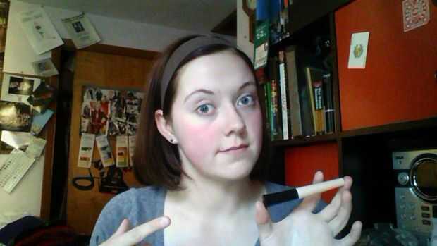 Siguiente, cartilla de sombra de ojos. Sólo lo suave sobre los párpados hasta las cejas. Los dedos un gran trabajan para esto también.