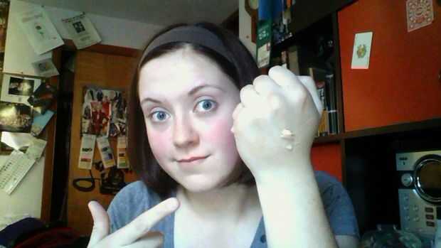 Para empezar, pone un poco de esa cartilla de cara todo el rostro. Sugiero que exprimir de la botella y en la parte posterior de su mano dejarlo calentar un poco y hacerla más fácil de esparcir. Ya no estamos preocupados por rayas, seguir adelante y utilice sus dedos para ello.
