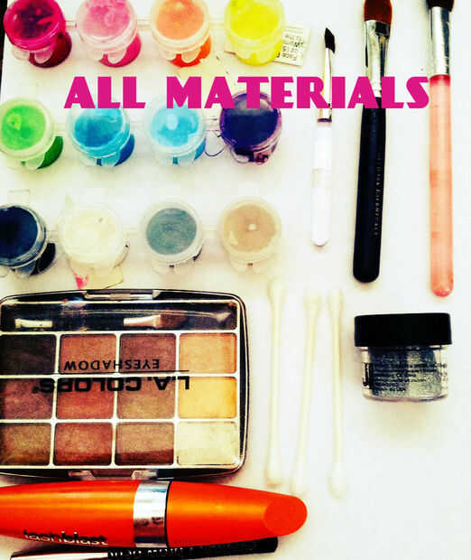 Los materiales que necesitas son pintura los colores son rojo o rosa, negro, blanco y amarillo., cara brillo y cepillos (usted puede ver los tamaños)