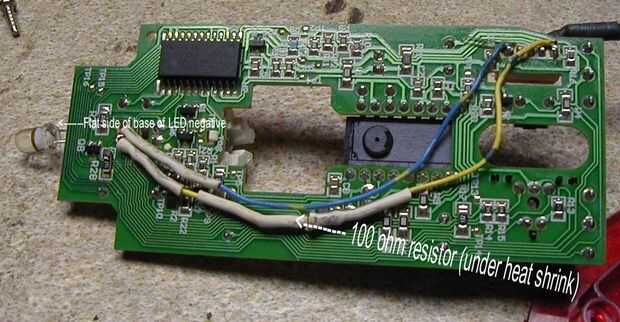 Este paso puede variar con el mod está haciendo. Soldado un 100 OHM resistencia en línea con el + (más) conducir en 3 color led y puesto que se trata de un ratón USB, conectar los cables directamente a la + y - conectores en la placa de circuito. Encontré este peticular LED es sensible a los requisitos actuales, de mucha resistencia y que todos los colores no luz o ciclo. Demasiado poca resistencia una tendrá una vida muy corta!. El voltaje medido fue aroung 5 vdc. Monte el LED de tal manera que quepan en la lente y dar le la iluminación efecto te quiere.