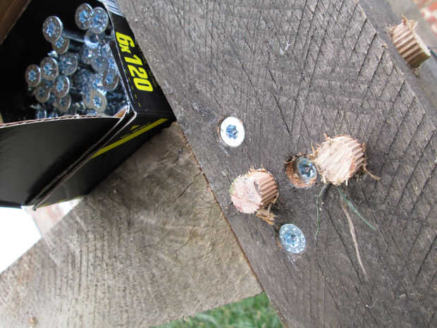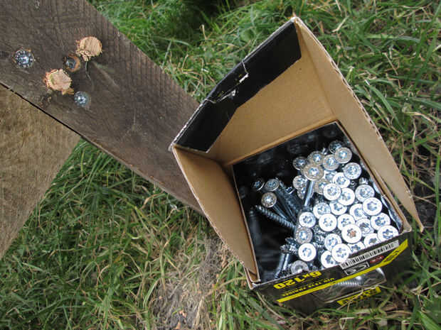 Después de la primera lluvia, una de mis fijaciones no celebrar y decidí reforzar cada esquina con pesado 6mm autoperforantes tornillos para madera, atornilladas de la desventaja al revés para hacerlos invisibles desde la perspectiva de los hombres. O realmente muy bien visible desde layin'-drunk-on-the-floor-again-perspective.