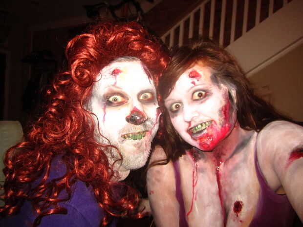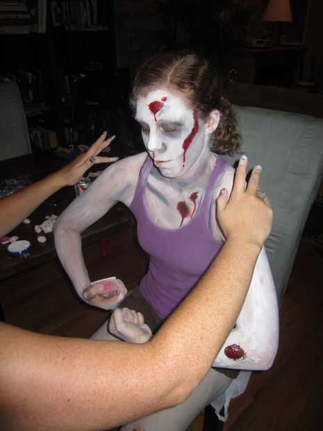 Quería dar a mi zombie lady una garganta de ahorcó un aspecto agradable, así que aplica algunos pintar morado, amarillo, verde y negro a mi mano y entró en el agarre de la muerte. (Por favor no realmente ahogar a tus amigos. Es grosero).