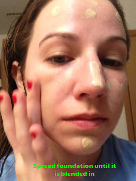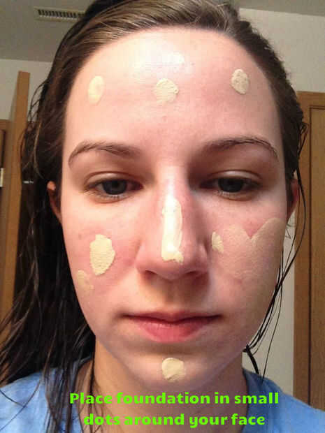 Aplique la base líquida en tamaño de uña puntos a tus mejillas, nariz, barbilla y frente. Utilice sus dedos para estirar suavemente la Fundación hasta que se mezcla en tu rostro. Es importante que el maquillaje se extiende totalmente para conseguir el look más natural. Esto ayuda incluso a la piel y dar el resto de tu maquillaje algo que ponerte. También quiere asegurarse de que usted completamente mezcla la Fundación alrededor de su cuello, por lo que no hay diferencias de color entre la mandíbula y el cuello.