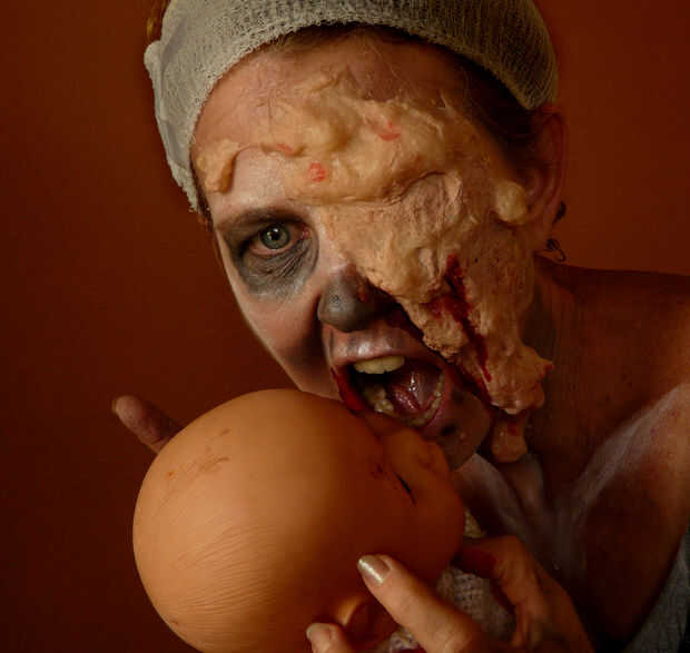 Para hacer eso, pasé semanas probando diferentes brebajes caseros que se comportarían como látex maquillaje y finalmente vinieron para arriba con una receta casera de "látex" utilizando harina de tapioca. Barato, fácil, rápida y útil en diferentes proporciones de harina al agua para la fabricación de falsa piel, senos, cicatrices, etc..