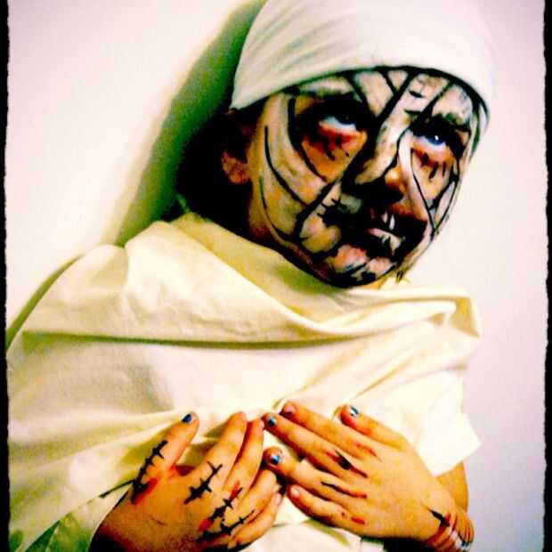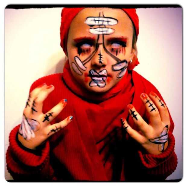 Mi nombre es Sam y este es mi traje, "Mentiroso." Yo soy el vestido con el traje y también el artista que aplica todo el maquillaje. La idea era hacerla como la palabra "Mentiroso" fue tallada en mi cara y yo estaba en algún tipo de in