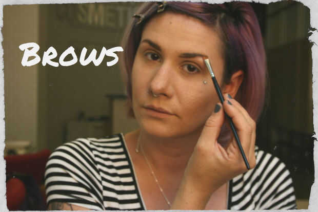 Las cejas deben definirse naturalmente--no hay frentes de corrector para este look! Estoy usando un cepillo duro de anguloso, ligeramente humedecido, con una sombra marrón cool un tono más claro que mis cejas reales de mi paleta Neutral de pigmento. Comencé frotando mis cejas en su lugar con un limpio spoolie, delineando la parte inferior de mis cejas y extendiendo la cola. Sin recoger ningún producto más, había mezclado la sombra hasta en mis cejas con mi anguloso del cepillo en un movimiento rápido hacia arriba. Entonces fue sobre ellos con un gel de cejas clara para definir. `