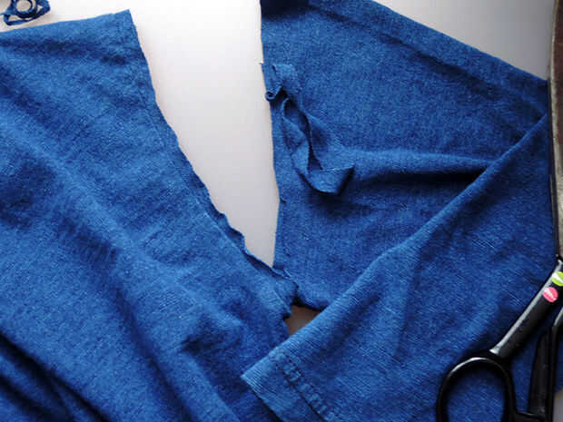 Corte las mangas, deja tejidos manga mitad o 1 pulgada de los agujeros del brazo. Recortará ambas mangas (casi) mismo.