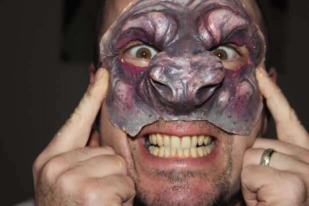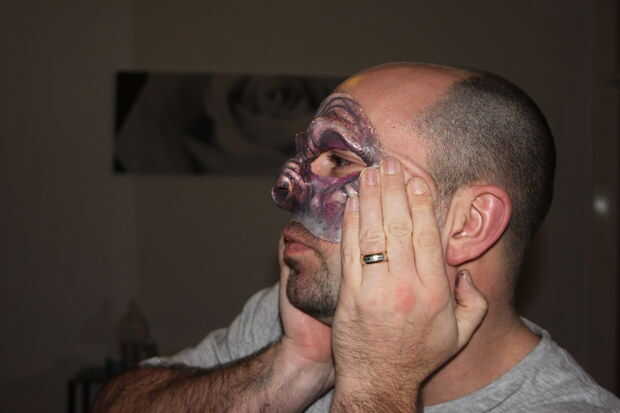 Yo uso Pros Aide o espíritu de las encías (aunque encontrar goma de alcohol irrita la piel un poco pero es más barato) que funciona bien sólo asegúrese de aplicarlo a la piel y prótesis luego ambos deje secar para crear una superficie stickable luego aplicar más ayudante pros de la prótesis teniendo cuidado de cubrir todos los bordes y aplicar al pecado, suavizar los bordes.
