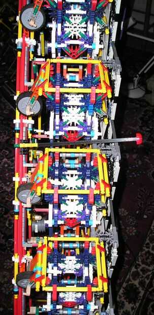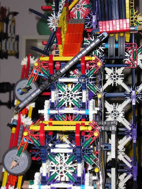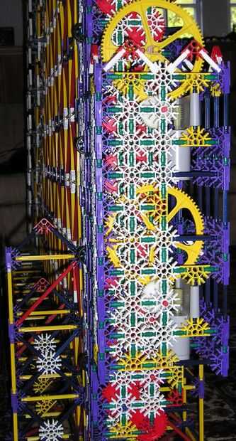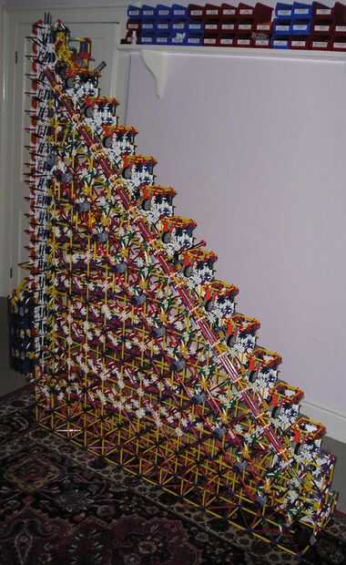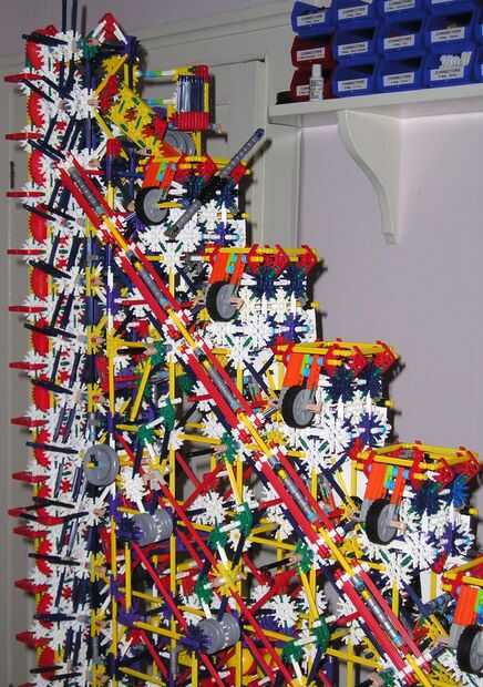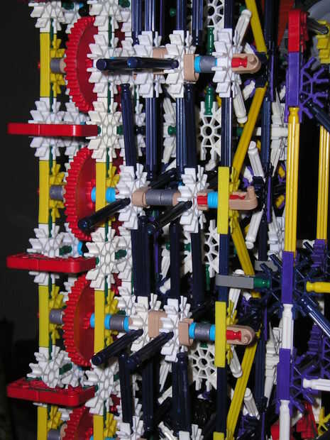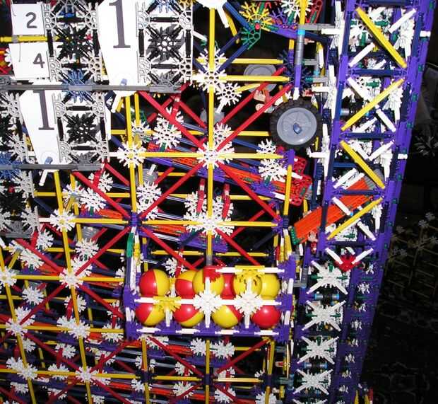 La máquina utiliza poco más de 10.000 piezas, pero una versión podría hacerse que utilizan mucho menos: puede haber pocas columnas, la elevación de la bola no es estrictamente necesaria, los embudos de la bola no debe ser tan elaborados, etc..