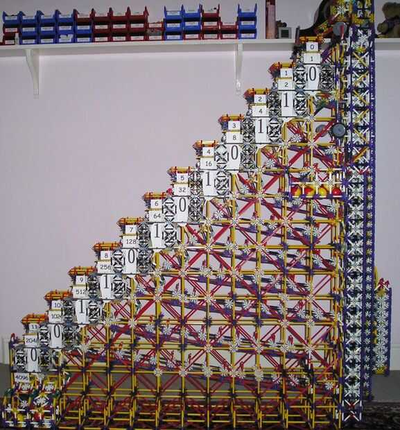 El siguiente video muestra la máquina que cuenta y cómo puede usarse para sumar, multiplicar y restar números binarios.