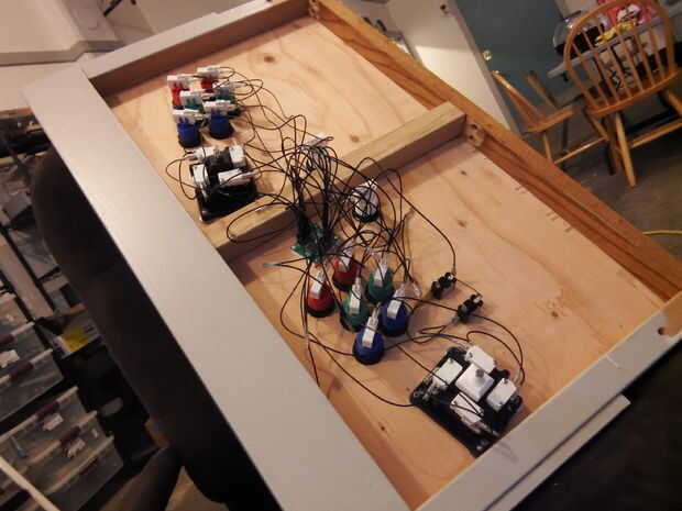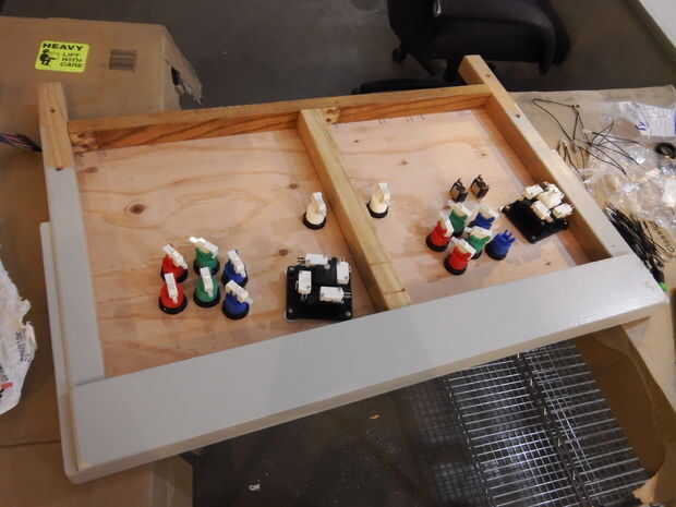 Después de comprar los botones y joysticks de tu agrado, simplemente colóquelos en los orificios en el tablero de control. Si lo desea, puede agregar más botones. Utilizamos palancas de mando de botones estilo americano con un tablero de Jamma y el kit viene con un PCB y cables: