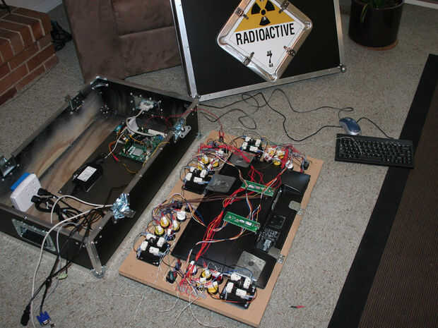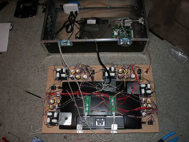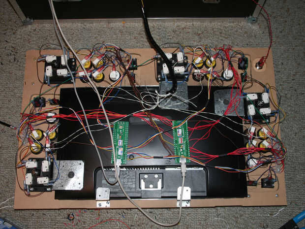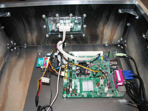 Cableado potencialmente puede conseguir un poco sucio, por lo que recomiendo tomarse su tiempo y tratando tratando de mantener organizado. También es útil disponer de diferentes colores de hilo, para que puedas ver fácilmente lo que está conectado a lo que a simple vista. Comience conectando todas las terminales negativos juntos en una cadena de Margarita en todos los botones y palancas de mando y conecte al terminal de tierra en el tablero de la interfaz de control. Ejecute un cable de cada botón a una terminal abierta en el tablero de la interfaz de control. La interfaz de control que compré tiene una función especial, que es esencialmente la tecla "shift", así que cuando se presiona hacia abajo, todos de las teclas cambio y pueden asignarse funciones separadas en el emulador/frontend. Conecté esa clave a los interruptores de piloto de combate, para ser utilizado para funciones de administrador (saliendo a las ventanas, apagar la máquina, etc.). Alambré la llave a la energía terminal de la placa base, por lo que enciende cuando se gira la llave en la cerradura. La interfaz de control está conectada al puerto usb o teclado en tu PC. El equipo que utilicé fue un combo de Motherboard, Tarjeta madre, procesador de baja potencia consumo, alimentado con una batería de portátil. Porque estaba un poco preocupada por un disco duro estándar consigue demasiado caliente en una caja sin ventilación, por lo que terminé usando una tarjeta Compact Flash como disco duro. Menos mover demasiado las piezas. La computadora y el monitor estén enchufados en un protector de voltaje pequeño, que está conectado a una caja y con cable a la toma AC.