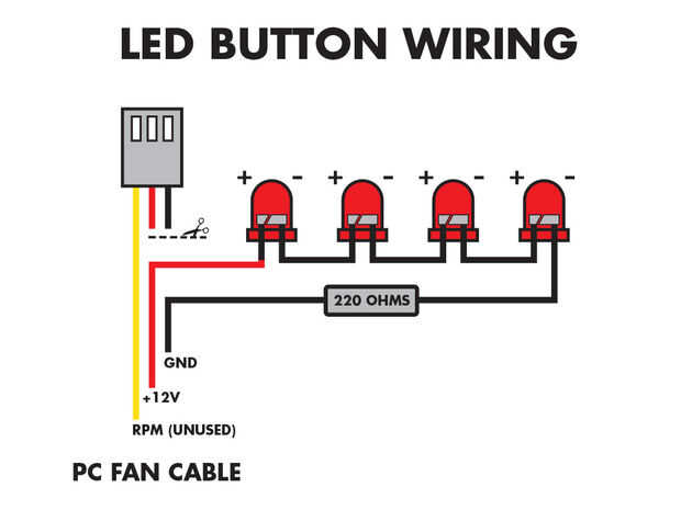 Los 4 botones iluminados de rojo también tienen que ser alimentado para conducir los LEDs dentro. Tuve una conexión adicional del ventilador de PC en la alimentación que modifiqué para alimentar los LEDs en una matriz con una resistencia de 220 ohm. He sacado en un diagrama de arriba. Podría también utilizar uno de los otros conectores PSU, sólo asegúrese de que es 12v.