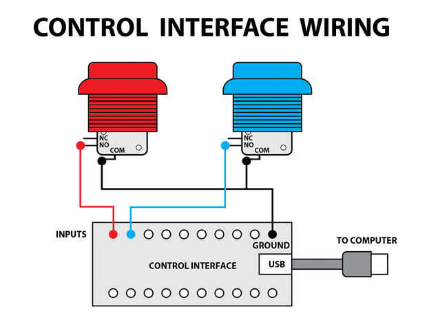 Conectado a la computadora es una interfaz de control, bruja es esencialmente la tarjeta de circuitos de teclado, pero sin todas las teclas físicas. Cada uno de los botones y joysticks consisten en interruptores SPST momentáneos que individualmente están conectados a terminales en la interfaz de control. Cuando se pulsa un botón, envía un golpe clave a la computadora. Cuando se configura el emulador y el frontend, asigna esa tecla a la acción deseada cuando se presiona el botón. ¡ Simple!