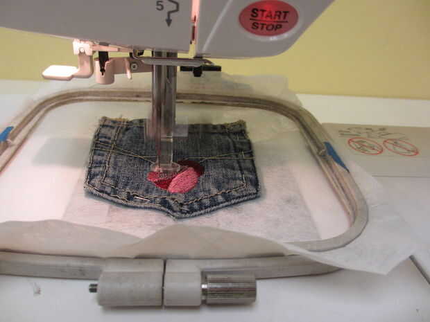 Ya que estos son pantalones vaqueros bebé elegí el diseño de Mariquita. Puesto que la bolsa era demasiado pequeña para el aro. Cubrió el bolsillo en el centro del aro en la parte superior estabilizador. Una vez me puse con él todos que vi la máquina de trabajo; cambiando el hilo como se indica.