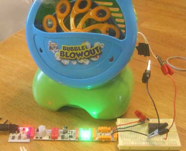Hacer los niños bailan de burbujas! Utilice littleBits y un relé de 5V para hackear su máquina de burbuja. Se trata de un solderless instructable. littleBits conecta magnéticamente, y vamos a usar un protoboard para el relé.