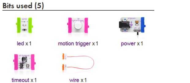 littleBits utilizado: potencia, disparador del movimiento, tiempo de espera, led, alambre