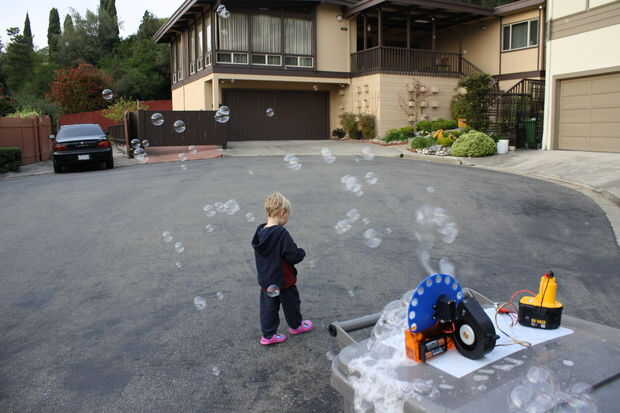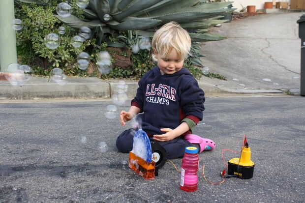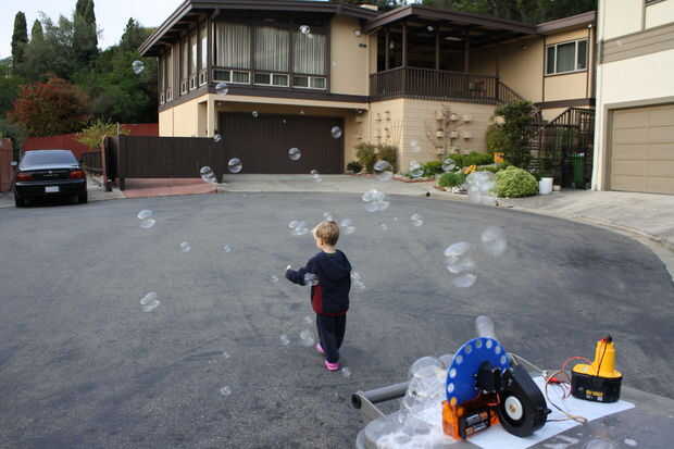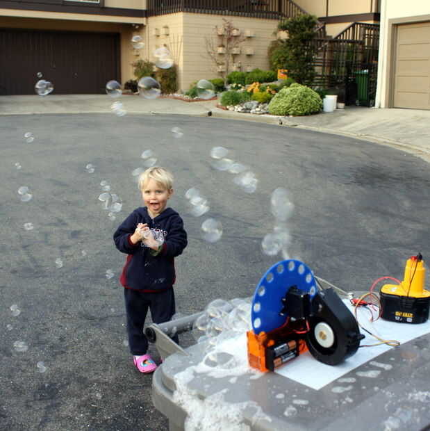 Mi máquina de burbuja se hizo para entretener a los niños de mis amigos. Ella ama las burbujas pero está en una edad donde les sopla ella misma se golpea algo o señorita (no mencionar a desordenado). Pasó muy felizes 15 minutos corriendo a través de y alrededor de ellos en la calle exterior, afterwhich los adultos caminaron jugar con las burbujas para ver si irían más alto de la calefacción, o experimentando con mezclas de diferentes burbujas para ver si cualquier lugar notablemente mejor.