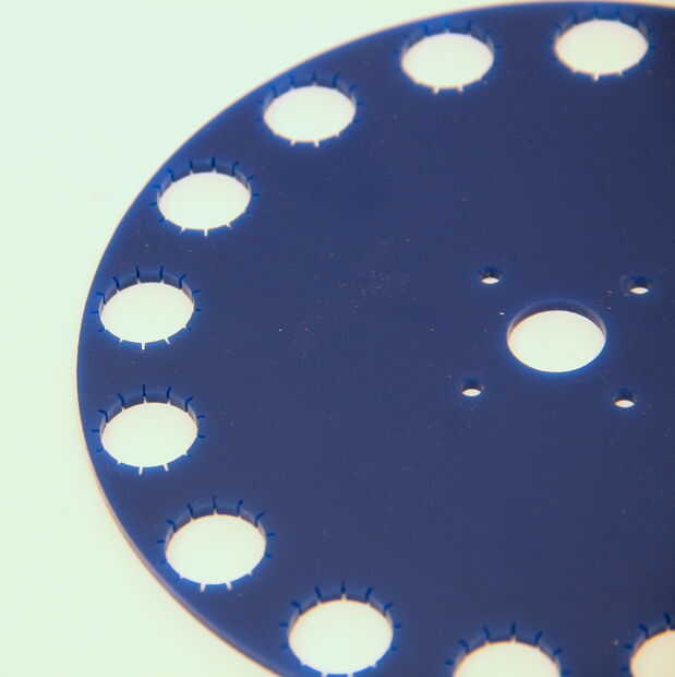 Mina se corta de 1\8 "acrílico con 16 agujeros alrededor un perímetro de 6". Cada agujero tiene ranuras de corte en lo que podrá mantener más líquido. Hay agujeros en el centro para montar a un brazo de servo estándar con tornillos autoroscantes.