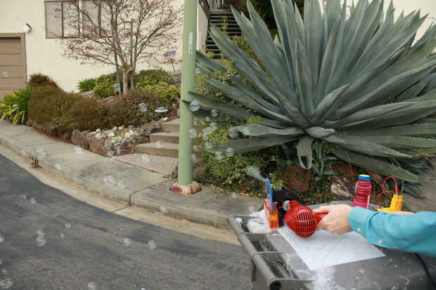 La solución de burbuja que utiliza era 1/2 plato lavarse líquido y 1/2 agua como pronto corrí fuera de la botella original de burbujas de milagro. Esta mezcla de 50: 50 funcionó muy bien, aunque algunas personas también recomiendan una cuchara llena de glicerina tirado demasiado.
