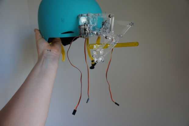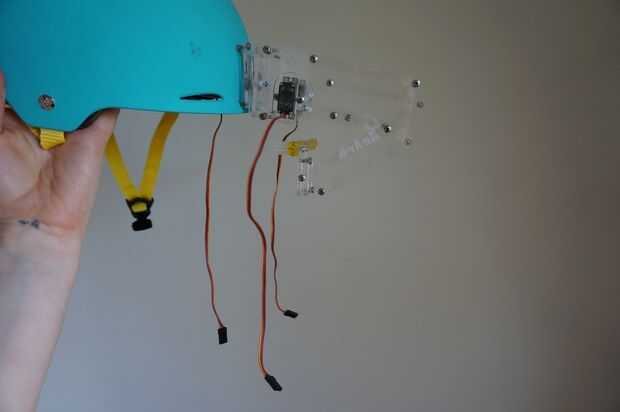 Coloque el brazo del robot para que el cuerno del servo en la parte inferior del brazo robot se monta sobre el motor servo conectado al casco. Asegúrese de que el brazo del robot se coloca para que puede mover el motor de servo tanto a la derecha como puedas a la izquierda.