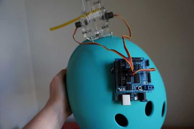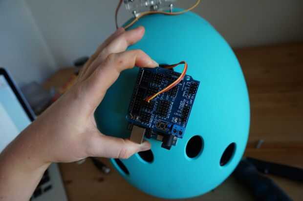 No tire del cable para el motor de servo inferior a través del orificio delantero que Arduino está ligada a y conectarlo al pin 7 del escudo servo. Luego conecte el servo del brazo inferior a la clavija 6 y la parte superior del brazo al pin 8.