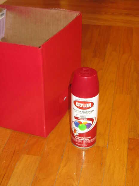 Cortar las solapas superiores de (salvando a usar más adelante), corte el fondo de la caja fuera tratando de mantener los bordes lo más rectos posible, con un cuchillo recto borde y arte (esto será más tarde la tapa y la parte superior de la máquina de gumball) de tres pulgadas. Utilizar pintura en aerosol para pintar el cuadro, el corte inferior y rojo aleta guardados. Usé pintura en aerosol Krylon rojo esmalte brillo.