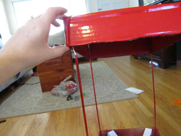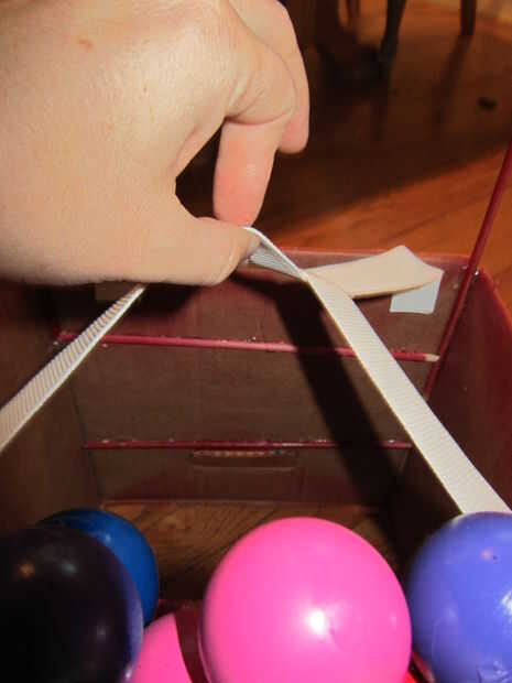 Una vez que han secado colocar un taco en una esquina de la caja de medida de la parte superior de la cabeza de su hijo y dejar tres pulgadas adicionales en cada extremo de la espiga (tres por debajo de la parte superior de la caja) y tres por encima de la cabeza del niño. Una vez medidos tacos cortados al tamaño adecuado. Colocar un pasador en cada esquina de la caja usando pegamento caliente. En forma de tapa o parte superior encima de tacos y utilizar pegamento caliente para fijar.
