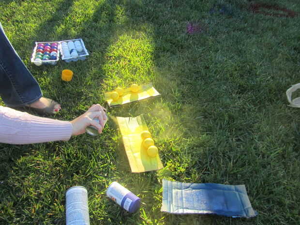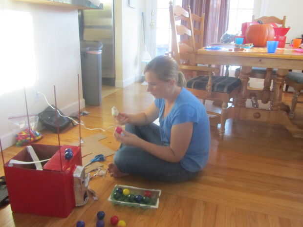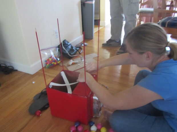 Cuadro Fit en niño otra vez. Tienen el cuerpo del niño completamente contra el respaldo de la caja. Debe haber unas cuantas pulgadas en la parte delantera entre el borde de la caja y el cuerpo del niño. Este espacio de Mida y corte la anchura de la aleta extra guardada a este espacio. Esto es lo que los chicles (pelotas de ping pong) que descansa sobre. Medir, cortar para encajar y fijar con cinta aislante roja. Arreglar pelotas de pintado ping pong en esta solapa con pegamento caliente