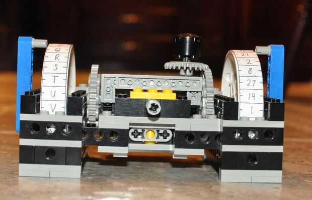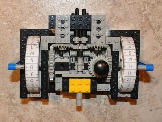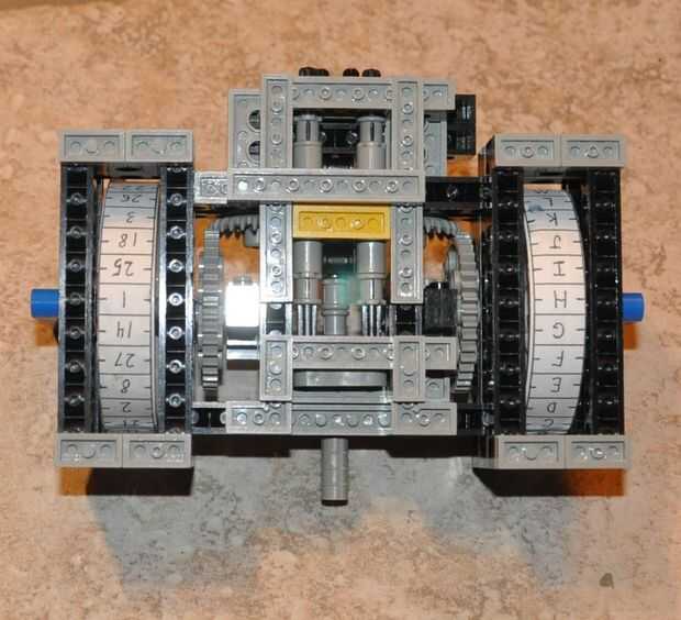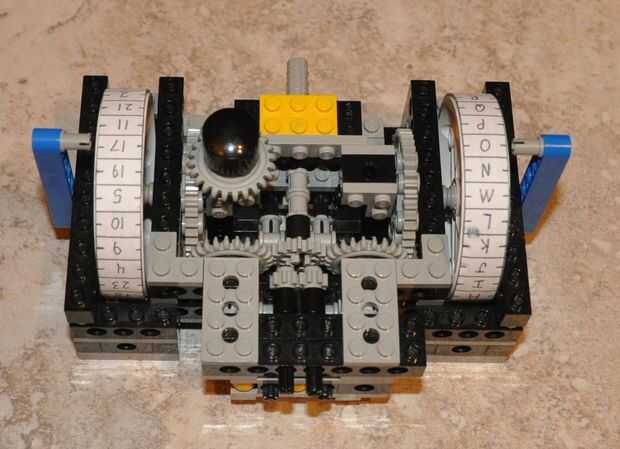 La máquina tiene dos bobinas, cada una con 27 caracteres. La bobina izquierda está marcada con las 26 letras del alfabeto inglés y una ranura para insertar un espacio. La rueda derecha está marcada con los números 1-27. Ambos carretes pueden listar sus sus respectivos personajes en cualquier orden. El importe total de cominations se alcanza tomando las configuraciones de posible carácter de cada rueda, 26. (factorial 26) y multiplicando por sí mismo puesto que la máquina tiene dos carretes. Puesto que éste es construido con Lego y sólo tiene un número limitado de piezas que se construirá fuera de, los engranajes no siempre se alinean perfectamente cuando usted cambia los modos, y tienen una pequeña holgura en ellos así. Sin embargo, yo he reforzado el modelo tanto como sea posible para reducir el error de codificación. Actualmente, la máquina tiene una precisión de aproximadamente ± 1/54 de una rotación. Siempre y cuando se tiene cuidado al operar la máquina, errores quedará inexistentes.