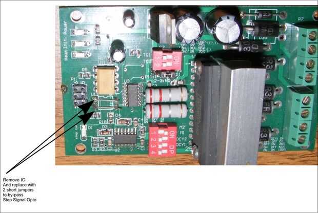 La última imagen es una foto de donde reemplazar el paso señal opto aislador con dos cables de puente corto. Simplemente corte el opto conduce y reemplazar con cables/jumpers como se muestra. Esto puente el opto y proporcionará la señal completa al chip 7414buffer. Esto debería eliminar se saltan pasos y o steppers farfulla.