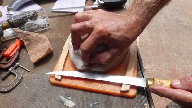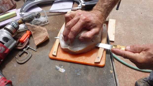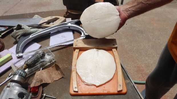 Para utilizar el olmo plataforma de corte, coloque un abulón desconchado y limpio entre las dos piezas de percha y apoyo contra el tablero en la parte posterior. Cortar con un cuchillo largo asegurándose de que ambos lados de la hoja son tocar la percha pero no corte la madera sí mismo. Es importante mantener la hoja plana así como para cortar la madera.