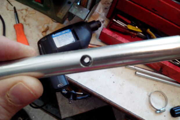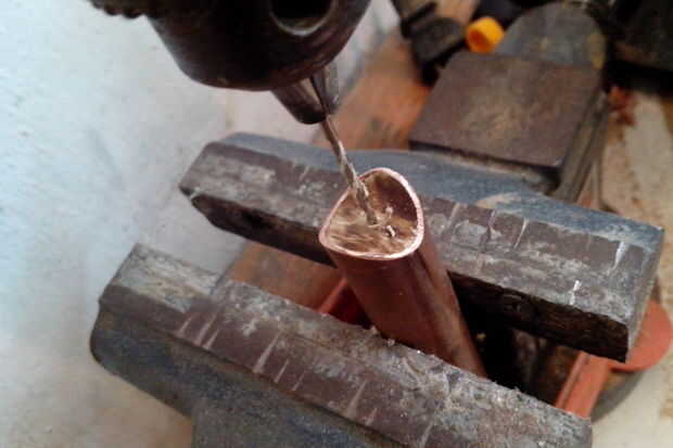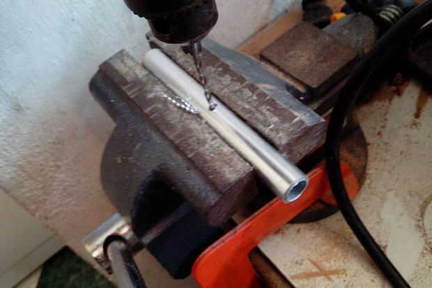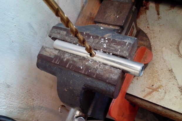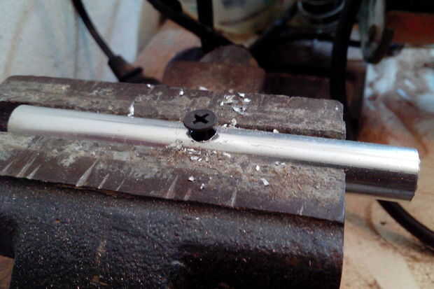 Suavemente Sujete el tubo fino en un tornillo de banco y perfore un pequeño agujero en el centro hasta el otro lado. A continuación, perfore un lado un poco más grande para acomodar la cabeza de un tornillo de 2" de largo. A continuación, perfore un pequeño agujero en el centro del tapón de madera en el mango.