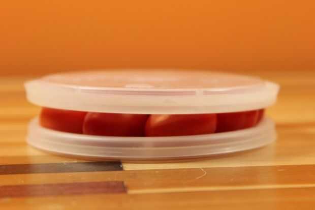 Exprimir tantos tomates en una tapa y coloque la otra tapa encima de ellos.