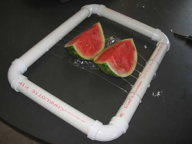 Me parece la forma más fácil de cortar sandía sin ensuciarte. Es una gran manera de servir a mucha gente, solo agarra una lanza y listo!