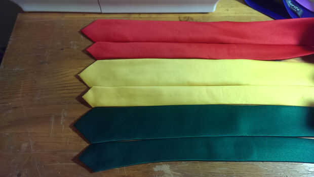 En el paso anterior mencioné tuve 2 de cada combinación de colores, he presentado 1 rotula amplia contra el extremo angosto de su pareja, por lo que los 2 reds ponen juntos, entonces los 2 amarillos, seguidos de 2 verdes etc.. Es ancho, estrecho, ancho, estrecho... que da algunas líneas interesantes en la pieza acabada.