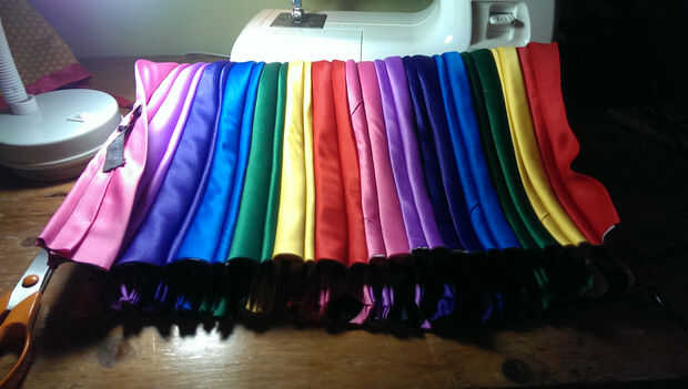 Después de coser los lazos juntos doblan la cubierta por la mitad longitudinalmente (para que doblez es perpendicular a las costuras) y cortan a lo largo de este redil, ahora pin y cosen las 2 mitades junto con 1 costura (así que terminas con un trozo más ancho más corto).