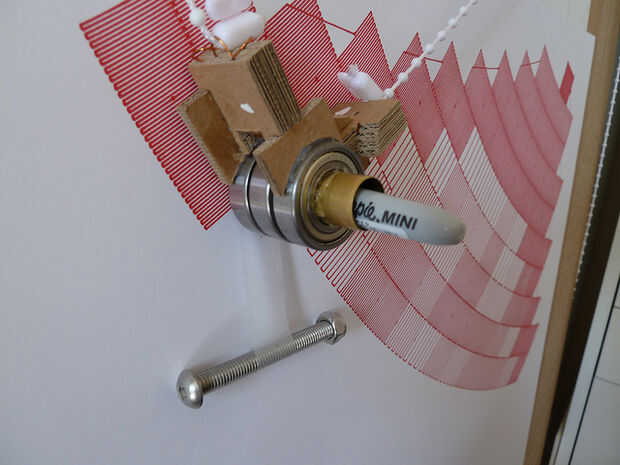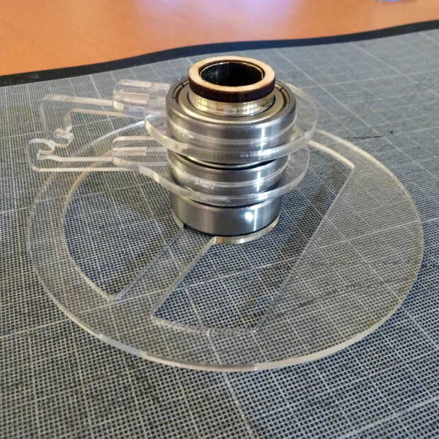 Hice uno de cartón ondulado y un CD en blanco, pegado a unos rodamientos de bolas (ver la última foto en este paso). Más tarde me gradué en algunos láser de lujo-dan cortar piezas (disponible a través de ponoko, o usted puede tomar la fuente desde el repositorio de github), pero el principio es el mismo. Yo he conectado el diseño en una EPS en un ponoko P1 tamaño tablero.
