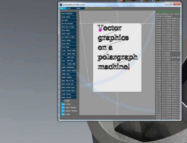 Ahora haga clic en procesar vectores para convertir el arte de línea de comandos polargraph y cargar todo en la cola de comando. Para el trabajo de vector, el comando mover directo se utiliza para indicar a la máquina dónde moverse, y siempre se dibuje en una línea recta en el tablero. El lado negativo es que es mucho más lento porque básicamente chuletas de la línea en decenas de líneas más pequeñas y tiene que hacer cálculos mucho más continuamente.