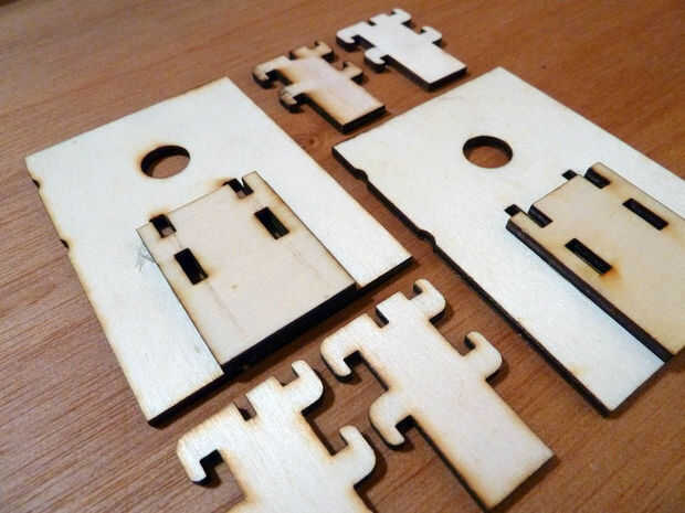He adjuntado los planes para un montaje del motor que lasercut de madera contrachapada de 3mm de espesor, pero no hay nada inteligente sobre él salvo que sólo las ranuras, por lo que los bits de Ciencias se pueden quitar fácilmente, dejando las placas de montaje principal en lugar. Me he metido en un trozo de tablero de Ponoko P1, y usted necesitará dos de estos corte.